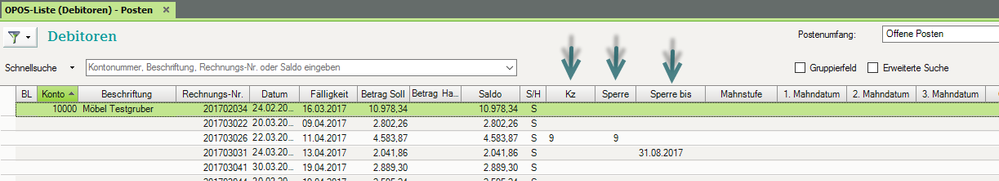 In den OPOS-Auswertungen erkennen Sie gesperrte Posten an einer "9" im Kennziffern-Feld oder durch die ebenfalls optional einblendbaren Spalten "Sperre" und "Sperre bis":