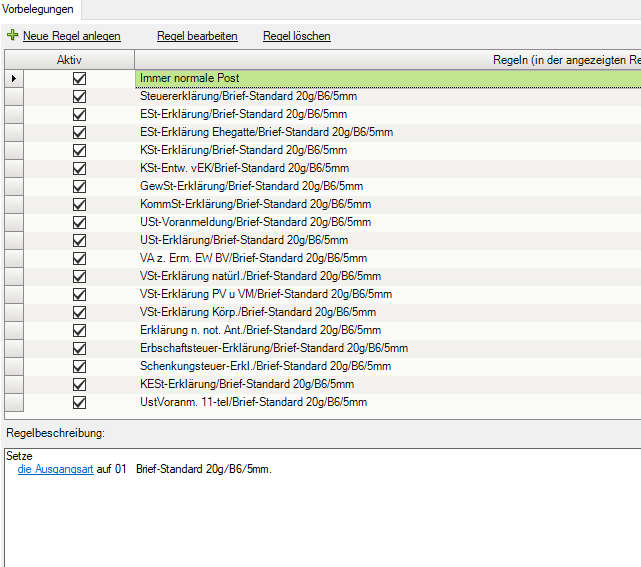 Oder habe ich es richtig verstanden, dass die Regel "Immer normale Post" geändert werden muss und die Ausgangsart "E-Mail" eingetragen werden muss?