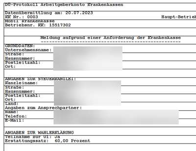 die Anforderung der Krankenkasse finden Sie im Übernahmeprotokoll. Die Übermittlung an die Krankenkasse wird auf der Auswertung 435 DÜ-Prot. Arbeitgeberkonto Krankenkassen dokumentiert.