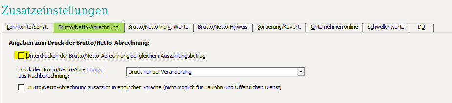 Kann es sein, dass der Haken in der Auswertungssteuerung bei Zusatzeinstellungen - Brutto-/Nettoabrechnung für den Druck bei gleichem Auszahlungsbetrag gesetzt ist?