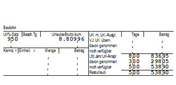 Den Urlaubsanspruch für gewerbliche Arbeitnehmer müssen Sie (bei richtiger Schlüsselung) nicht selbst vornehmen, da diese von Lodas automatisch ermittelt werden. Allerdings ist die Besonderheit, dass Arbeitnehmer sich den Urlaub erst "erarbeiten" müssen. Ohne Vorbeschäftigungszeit im Malergewerbe und ohne Schwerbehinderung beträgt der Jahresurlaubsanspruch 25,0 Tage. Pro Monat erarbeitet sich der Arbeitnehmer also einen Anspruch von 2,08 Urlaubstagen. Diese werden auf der Lohnabrechnung dann z.B. wie folgt aufsummiert: