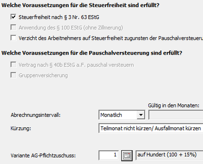 In der Registerkarte "Beiträge" wird Ihnen das Feld "Steuerfreier/SV-pflichtiger Betrag" angezeigt. Wählen Sie für den SV-pflichtigen aber steuerfreien Betrag, der monatlich abgerechnet wird, die Lohnart 4880 (BAV, stfr, sv-lfd, zus.Grenze) aus.